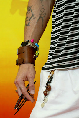 His most recent tattoos are, a quote which reads "Silence Exile Cunning" from the book by James Joyce A Portrait of the Artist as a Young Man. Plus three small hearts on his left triceps, for his wife and children "Vanessa, Lily-Rose, Jack". Johnny also has 3 tattoos on his legs, including a skull and crossbones with the phrase "death is certain", a question mark with an "X" in place of the dot, and three vertical stripes on his lower left leg. Checkout these pictures of Johnny Depp and his tattoo designs.