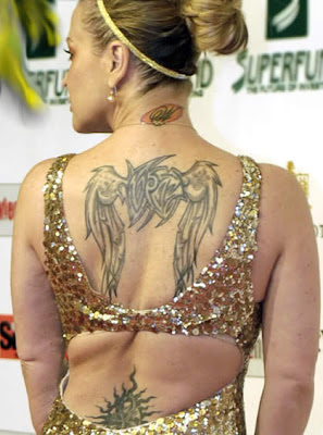 She has a large pair of beautiful angel wings with an interesting tribal design, on her back between her two shoulder blades.